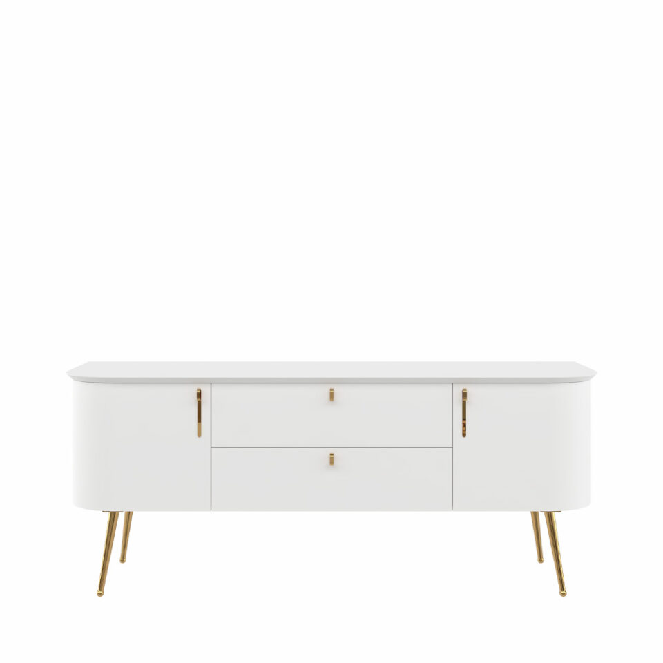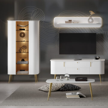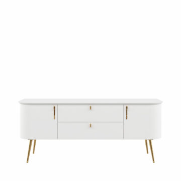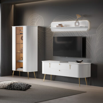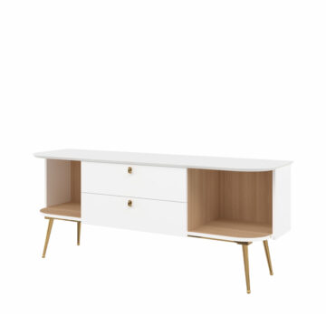 TV komoda Galet je eleganten in funkcionalen kos pohištva, izdelan z mislijo na trajnost in sodoben dizajn. Ponaša se z belo mat lakirano površino in kontrastnimi detajli iz naravnega furnirja, ki prostoru dodajo toplino in prefinjenost.