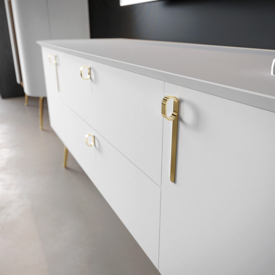 - Materiali: mat lakiran MDF, naravni furnir, kovina