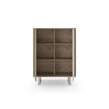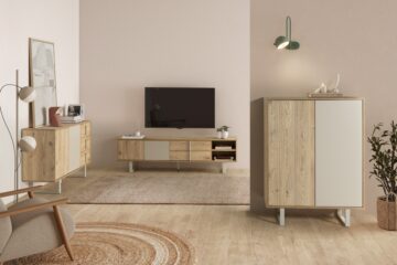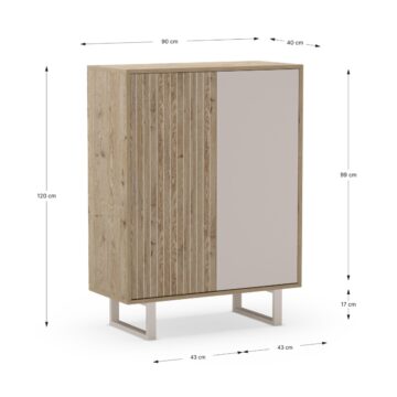 Eleganten videz komode Millay združuje sodoben dizajn brez ročajev in toplino dekorja naravnega lesa. Kontrast gladke sive površine in vertikalno utorjene lesne teksture ustvarja vizualno zanimiv in uravnotežen kos pohištva za dnevno sobo, hodnik ali jedilnico.