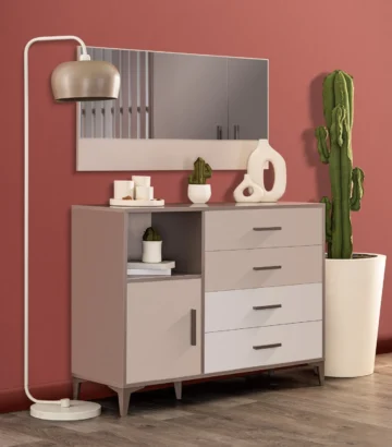 Komoda s predali in vrati Ria prinaša dodatno funkcionalnost in dekorativni pridih v sobe mladih. Zgornja površina komode je idealna za razstavljanje osebnih predmetov, kot so najljubše fotografije, majhne rastline ali drugi okraski, kar prostoru doda edinstveno noto in prilagodljivost.