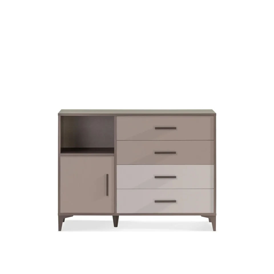 Komoda s predali in vrati Ria prinaša dodatno funkcionalnost in dekorativni pridih v sobe mladih. Zgornja površina komode je idealna za razstavljanje osebnih predmetov, kot so najljubše fotografije, majhne rastline ali drugi okraski, kar prostoru doda edinstveno noto in prilagodljivost.