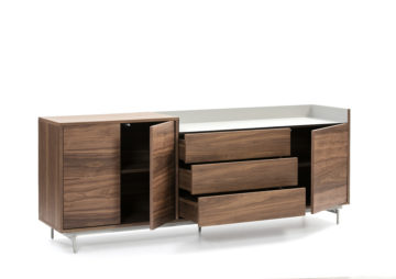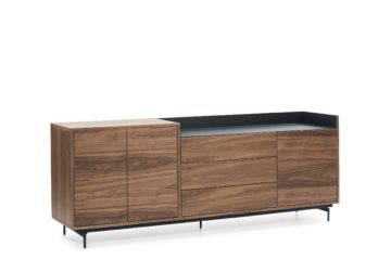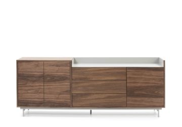 Kolekcija Valley temelji na univerzalnosti, tesno povezani z elegantnostjo. Ostre in jasne linije, novodoben sistem odpiranja na dotik in jesenov furnir so samo nekatere od zamisli kreativnega Cambre Designa. Vsak Valley kos je harmoničen spoj lesa in kovine. Komoda je izdelana iz MDF plošče, obogatene s furnirjem jesena, pločevine in kovine. Ima tri vrata, dve polici in tri predale. Izberete lahko barvo pločevine, ki se nahaja desno zgoraj: 1. Svetlo siva 2. Temno modra Dimenzija (dolžina x širina x višina): 200x45x78 cm Kljub svoji fleksibilnosti, stoji najbolje v zasedbi sorodnih izdelkov.
