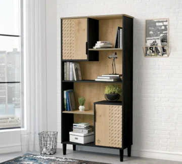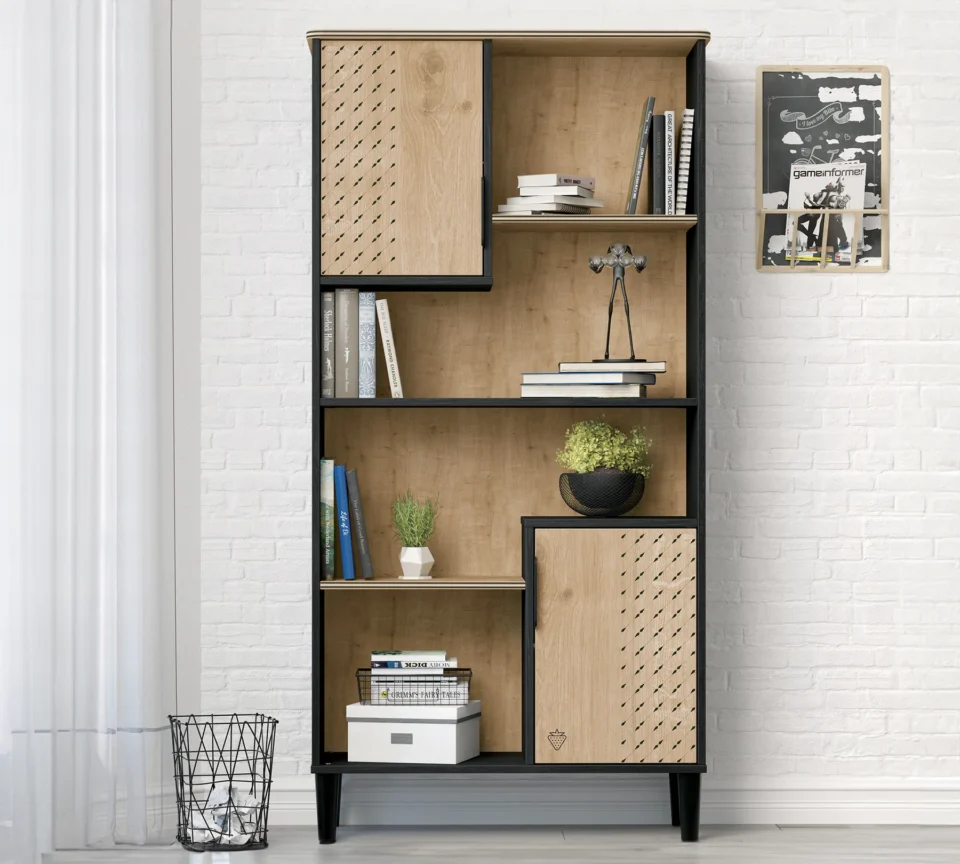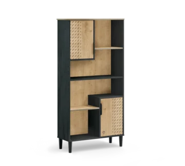 Široka knjižna omara Black v kombinaciji črne ina naravne barve s prostorno notranjostjo in policami, razdeljenimi v različnih intervalih, ponuja funkcionalno rešitev za najstniško sobo ter zagotavlja bolj organiziran videz s svojimi predali z vrati.