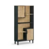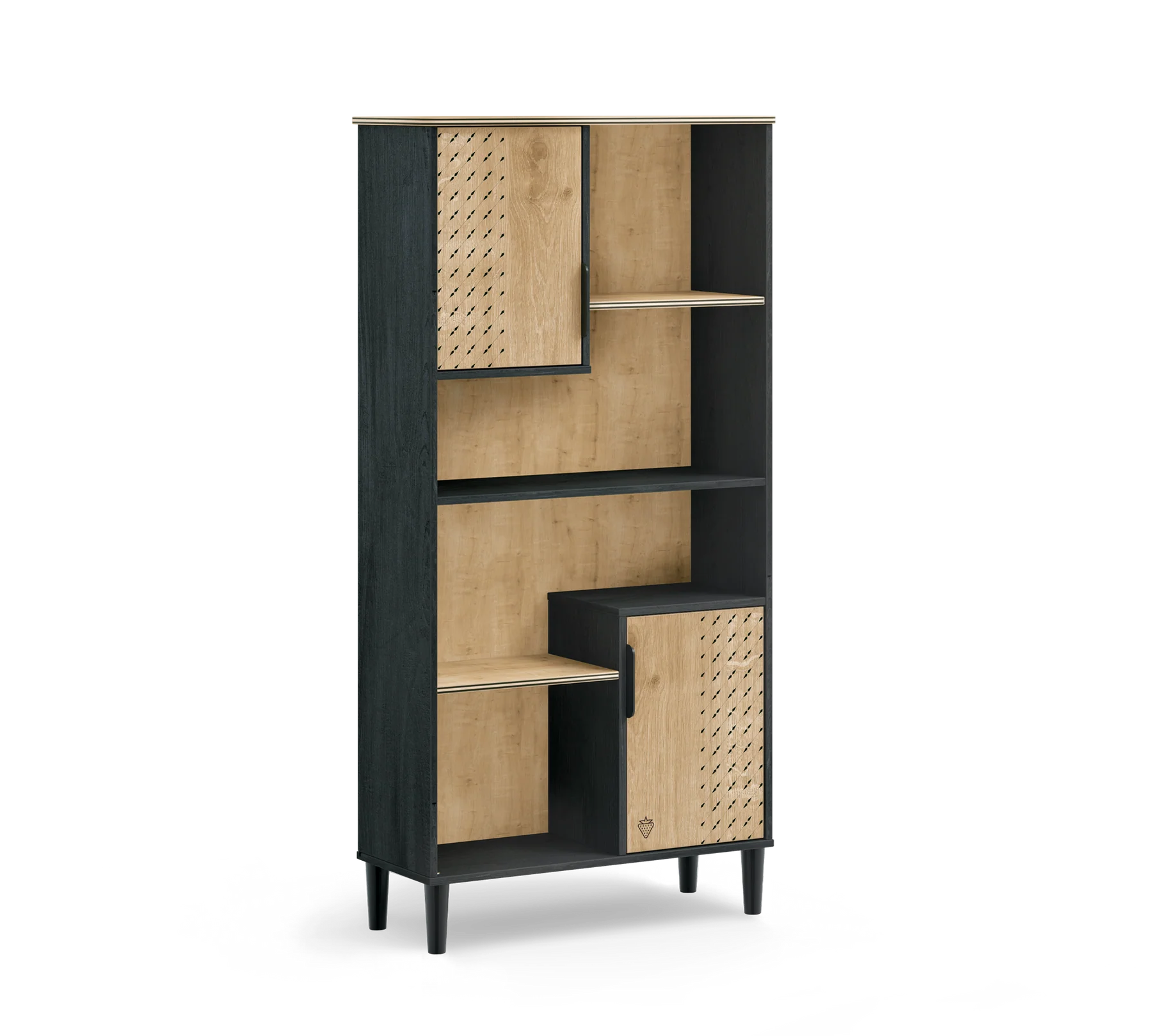 Široka knjižna omara Black v kombinaciji črne ina naravne barve s prostorno notranjostjo in policami, razdeljenimi v različnih intervalih, ponuja funkcionalno rešitev za najstniško sobo ter zagotavlja bolj organiziran videz s svojimi predali z vrati.