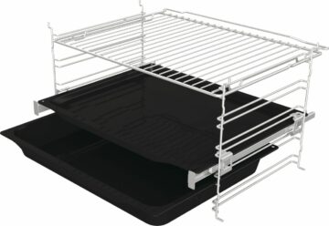 Pečica ima termično varovalo za samodejni izklop, funkcijo pizza, SuperSize in ExtraSteam. Osvetlitev pečice je zgoraj, pečica pa ima 1 globok emajliran pekač, 1 plitek emajliran pekač in mrežno rešetko.