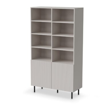 Značilnost police PAXOS so rebraste sprednje strani v elegantnem odtenku kašmirja, ki ji dajejo prefinjen videz. Minimalistična oblika v kombinaciji s črnimi kovinskimi elementi poudarja sodoben slog pohištva in mu daje lahkotnost in subtilno eleganco.