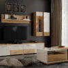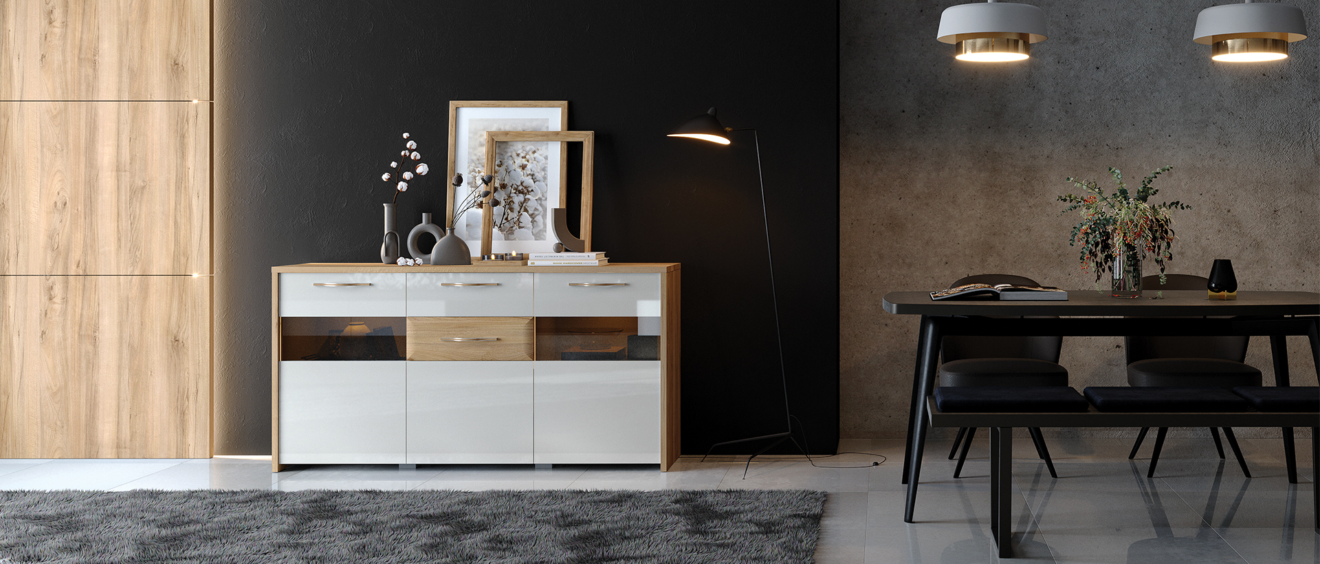 Za vse ljubitelje elegance je tukaj kolekcija pohištva dnevnih sob Gala. Narejena je iz kombinacije bež sijaj barve z dekorjem pacifik oreh barve v kombinaciji s kaljenim steklom. Fronte so iz mediapana, korpus pa iz oplemenitene pohištvene plošče. Vrata in predali imajo mehanizem mehkega zapiranja. Poseben videz elegance pa ji dodajajo ročaji. Vitrina ima dvoja vrata za katerimi so zgoraj dve stekleni polici in spodaj ena lesena polica ter en predal.