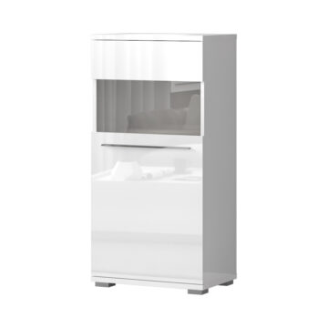 Vitrina Radda PIANO je UV lakirana na visoki sijaj v bež ali beli barvi. Vsebuje ena vrata v kombinaciji s steklom, ki se mehko zapirajo in tri police. Spodnja in zgornja plošča sta 25mm in s tem še močnejši oz. z večjo nosilnostjo. Ročaji in noge so kromirani. Omarica je iz zelo obsežnega sestavljivega programa, ki ima na razpolago ogromno elementov.