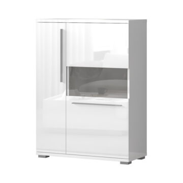 Vitrina Radda PIANO je UV lakirana na visoki sijaj v bež ali beli barvi. Vsebuje ena polna vrata (2polici) in ena vrata v kombinaciji s steklom (3police). Spodnja in zgornja plošča sta 25mm in s tem še močnejši oz. z večjo nosilnostjo. Ročaji in noge so kromirani. Omarica je iz zelo obsežnega sestavljivega programa, ki ima na razpolago ogromno elementov.