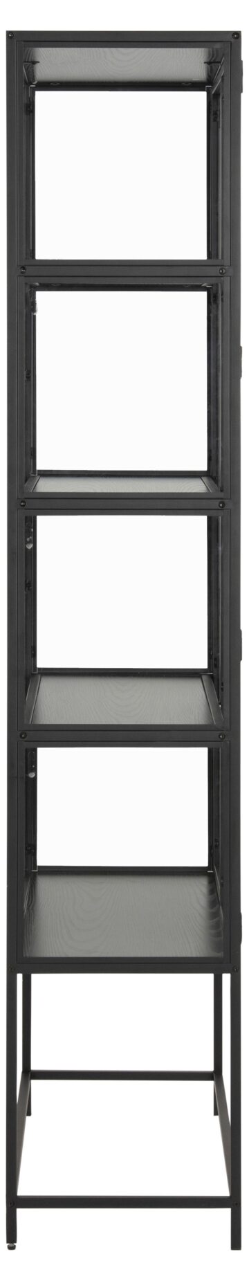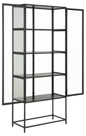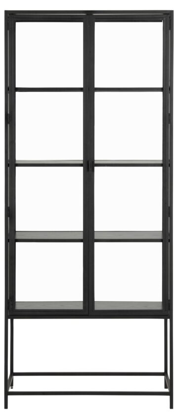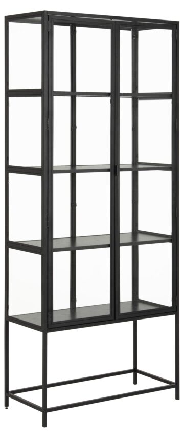 Vitrina Seaford je izjemno vsestranska in se bo lepo prilegala tako v kuhinjo kot v dnevno sobo. S svojimi štirimi policami ponuja veliko prostora za shranjevanje vaših potrebščin, medtem ko steklena vrata omogočajo, da so predmeti varno shranjeni, a hkrati lepo razstavljeni. Njena črna kovinska konstrukcija in industrijski dizajn prinašata sodoben videz, ki se zlahka zlije z različnimi stili notranje opreme.