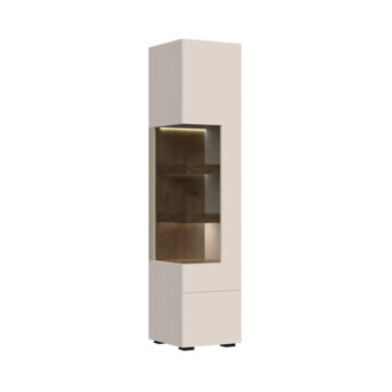 Hrbtišče vitrine je izdelano iz visokokakovostne vezane plošče z dekorjem iz hrasta tobak. Fronte in stranice so izdelane iz mediapana, obojestransko lakirane z UV lakom, ki ustvarja mat efekt v barvi kašmirja. Uporaba parsol stekla v rjavi barvi dodaja globino in teksturo.