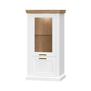 Vitrina Tara iz kolekcije dnevnih sob Tara je mešanica rustikalnega in sodobnega videza hkrati pa prostoru pridaja pridih luksuza. Vitrina je lakirana z UV mat lakom na vodni bazi in je v grafit sivi ali beli barvi z dodatkom barve pacifik oreha. Strop, dno in fronte vitrine so iz mediapana. Vitrina ima dvoja vrata za katerimi je ena polica iz kaljenega stekla, druga pa je lesena. Vrata imajo mehanizem mehkega zapiranja. Vitrina ima možnost notranje osvetlitve. Za osvetlitev potrebujete LED-napajanje, ki je na razpolago ob doplačilu. Dimenzija: Š 66 X V 132 X G 48 cm.
