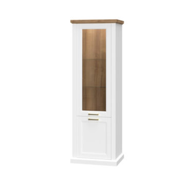 Vitrina Tara iz kolekcije dnevnih sob Tara je mešanica rustikalnega in sodobnega videza hkrati pa prostoru pridaja pridih luksuza. Vitrina je lakirana z UV mat lakom na vodni bazi in je v grafit sivi ali beli barvi z dodatkom barve pacifik oreha. Strop, dno in fronte vitrine so iz mediapana. Vitrina ima dvoja vrata za katerimi sta dve polici iz kaljenega stekla, ena pa je lesena. Vrata imajo mehanizem mehkega zapiranja. Vitrina ima možnost notranje osvetlitve. Za osvetlitev potrebujete LED-napajanje, ki je na razpolago ob doplačilu. Dimenzija: Š 66 X V 200 X G 48 cm.