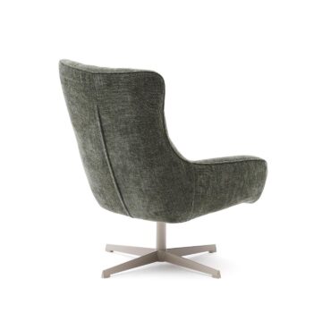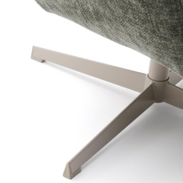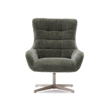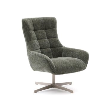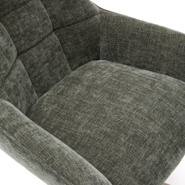 Vrtljivi fotelj Teryl v zeleni barvi združuje udobje in estetsko privlačnost. Njegova zasnova vključuje strukturirane kovinske nogice v sivi barvi, kar še dodatno prispeva k stabilnosti in trpežnosti.