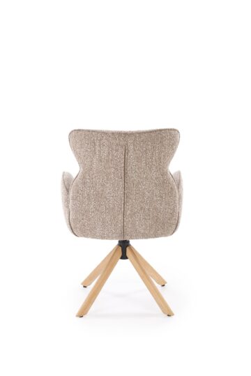 Vrtljivi jedilniški stol K585 združuje brezčasno eleganco naravnega lesa in sodobno funkcionalnost. Oblazinjen v prijetno temno bež tkanino ter podprt z masivnim hrastovim podnožjem, prinaša toplino, stabilnost in udobje v vsak prostor.