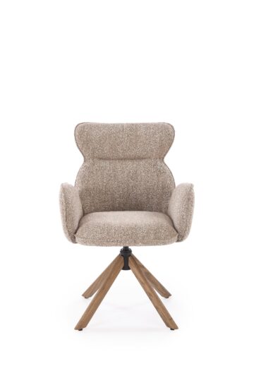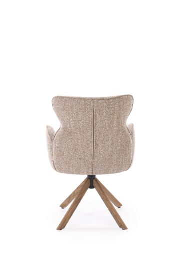 Vrtljivi jedilniški stol K585 združuje brezčasno eleganco naravnega lesa in sodobno funkcionalnost. Oblazinjen v prijetno temno bež tkanino ter podprt z masivnim orehovim podnožjem, prinaša toplino, stabilnost in udobje v vsak prostor.