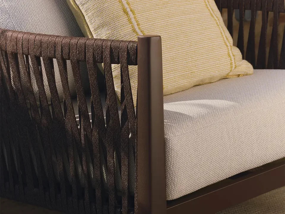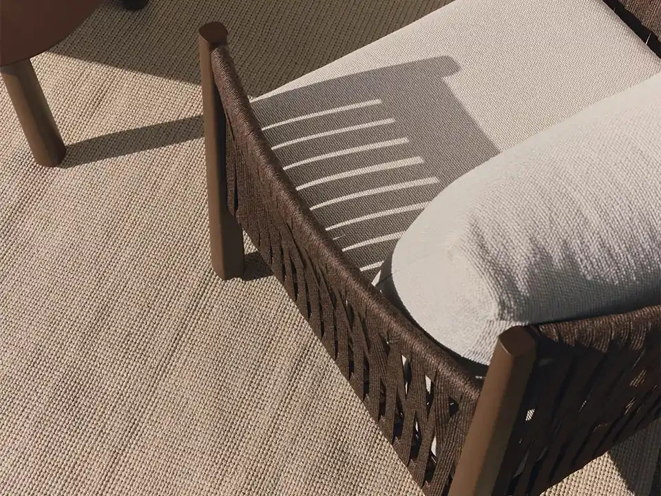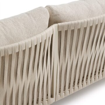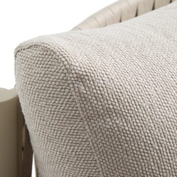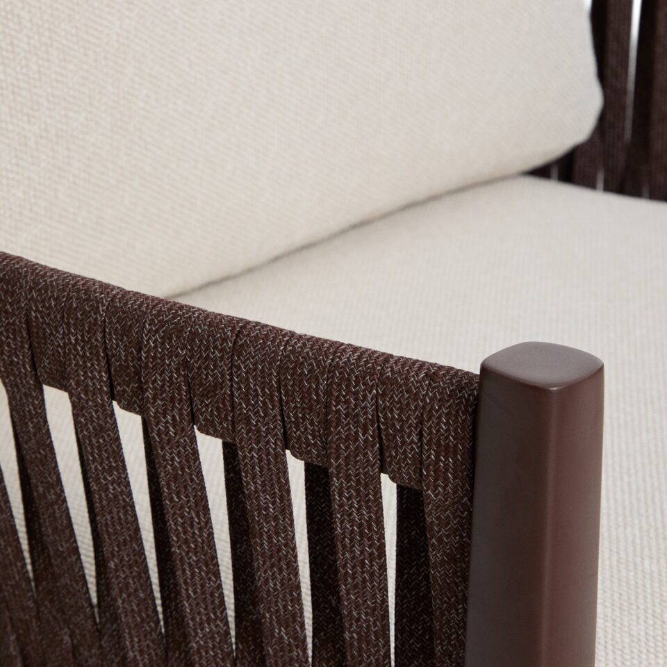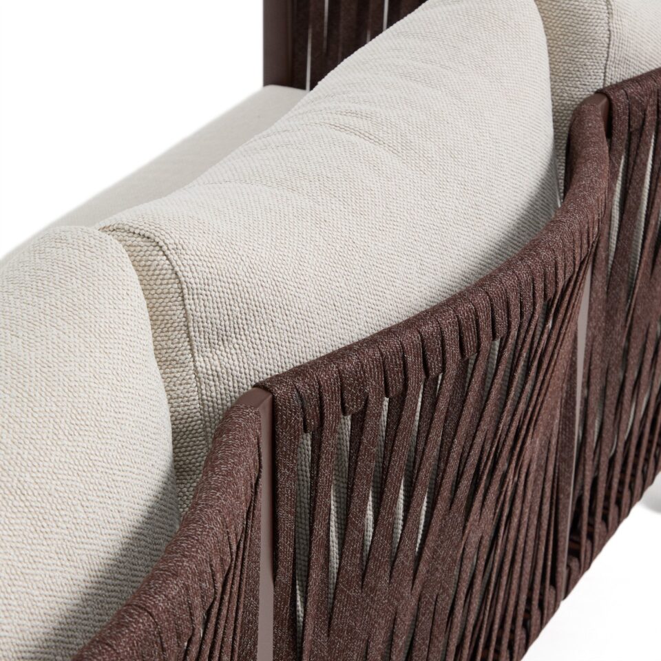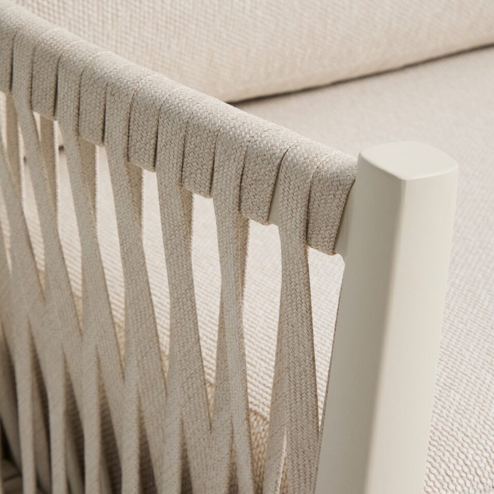 - Udobje in estetika: Ročno prepleteno naslonjalo iz sintetične vrvi dodaja udobno, objemajočo teksturo in harmoničen videz.