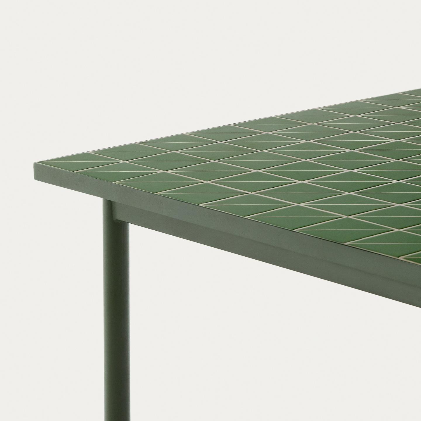 - Ročno izdelana plošča mize: Unikatna plošča mize s čudovitim ročno izdelanim geometrijskim mozaikom iz keramike in cementa, ki doda poseben vizualni poudarek.