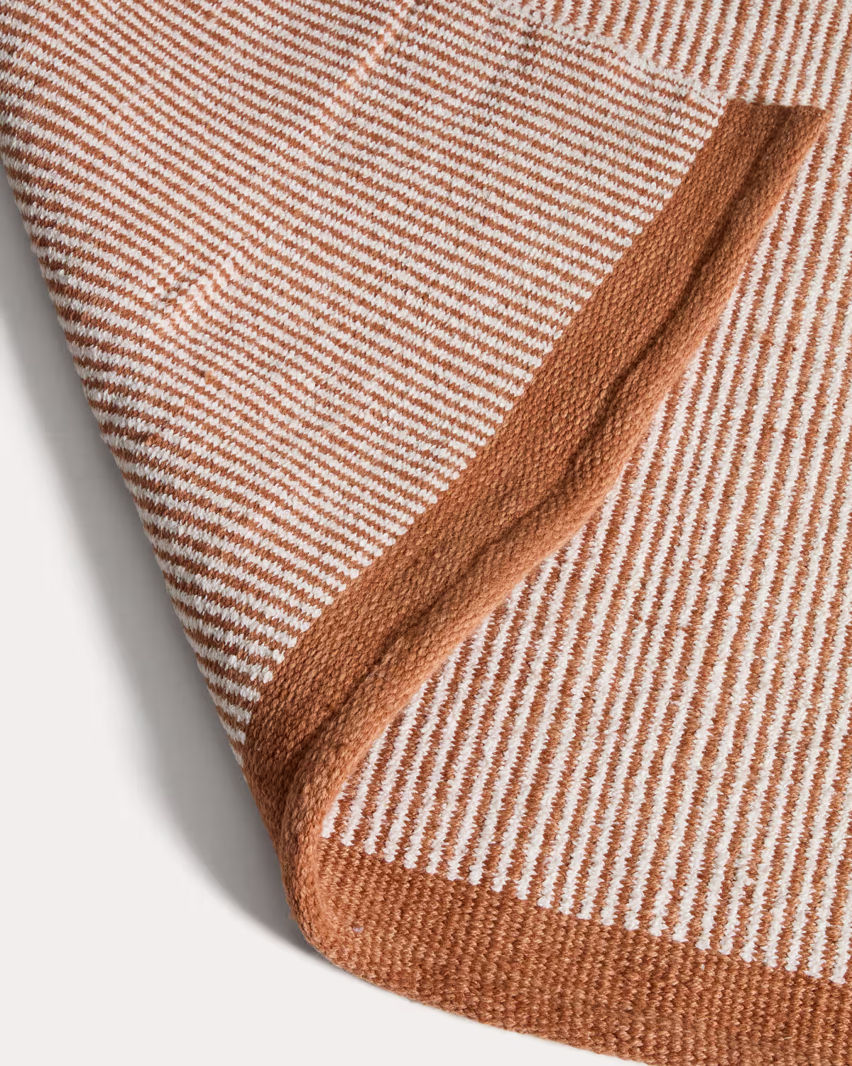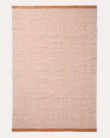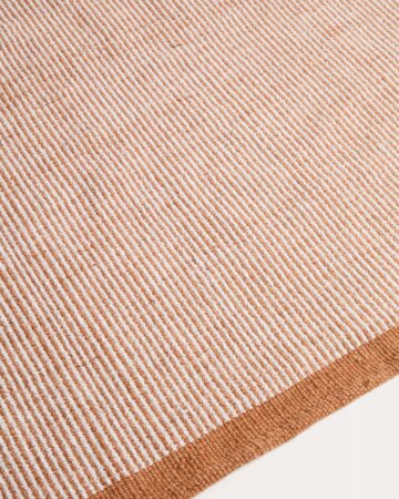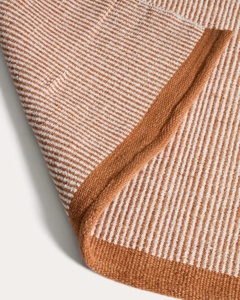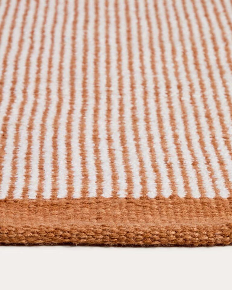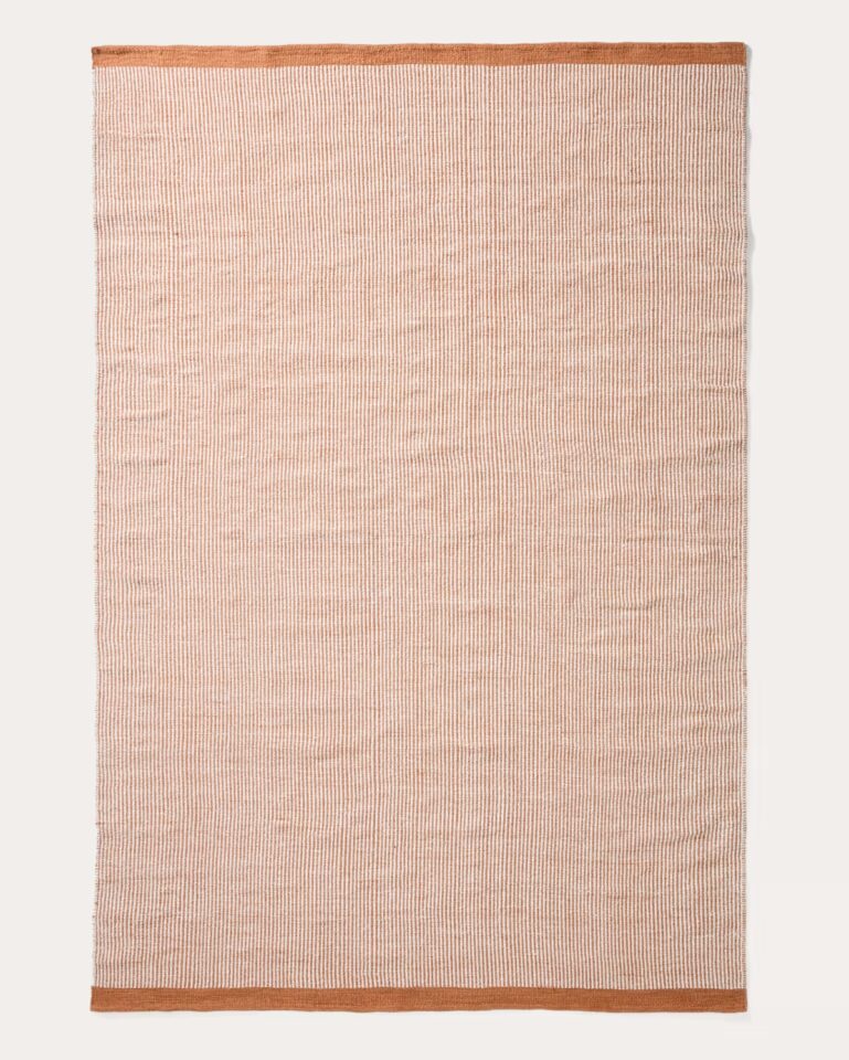 Preproga Tinei z oranžnimi črtami iz recikliranih PET vlaken prinaša živahen poudarek in funkcionalnost v notranje in zunanje prostore. Struktura črt in barvni zaključki na robovih ustvarjajo dinamičen, a uravnotežen videz.