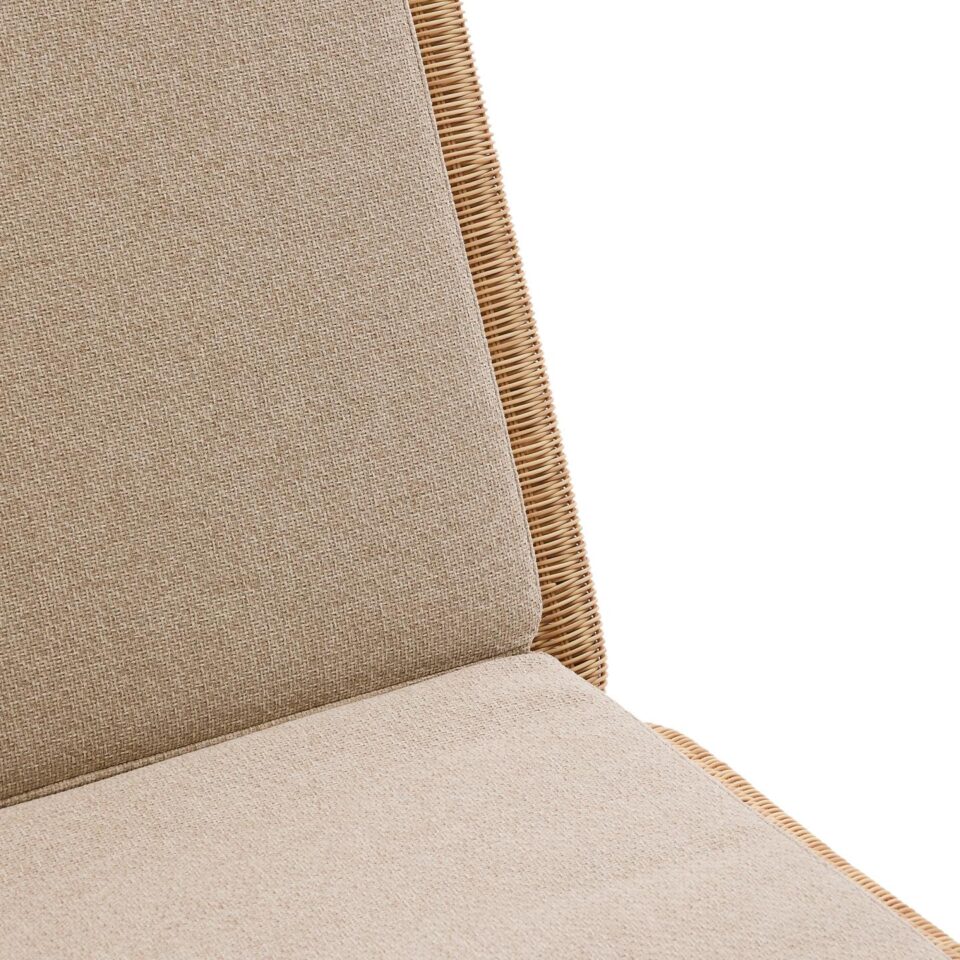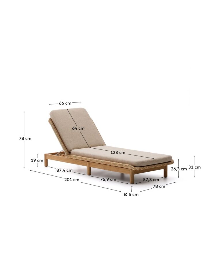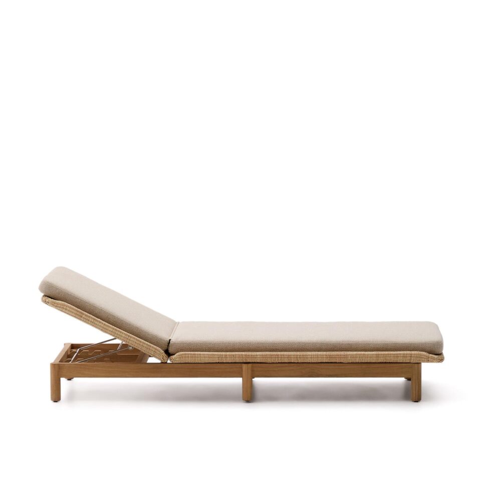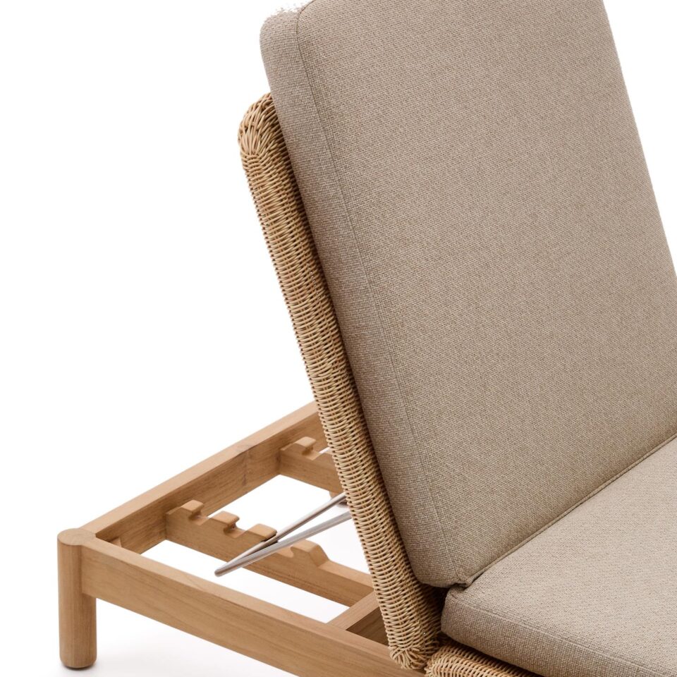 Konstrukcija iz tikovine, aluminija in pletenega ratana zagotavlja stabilnost ter odpornost na zunanje razmere, blazina s penastim polnilom pa omogoča udoben počitek. Prevleka je snemljiva, tkanina je vodoodbojna, odporna na obrabo in enostavna za čiščenje. Naslon je nastavljiv, gumijaste podloge na nogah izboljšajo stik s podlago, največja nosilnost znaša 115 kg.