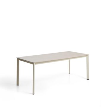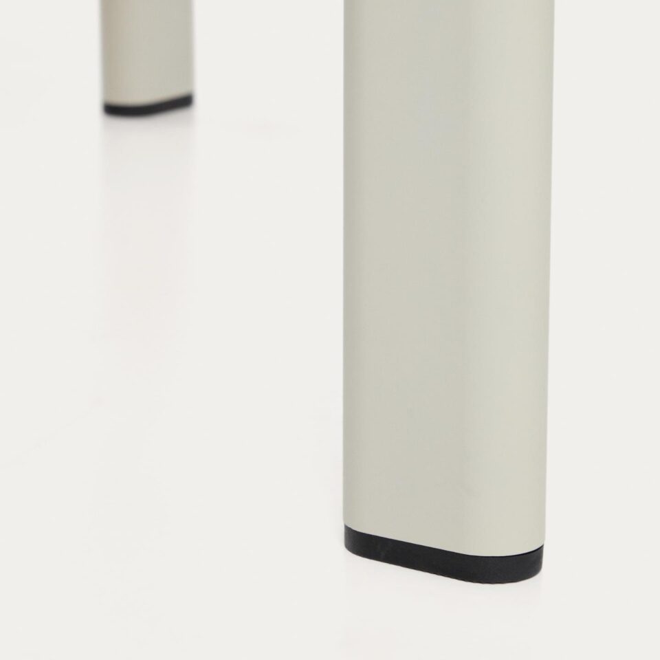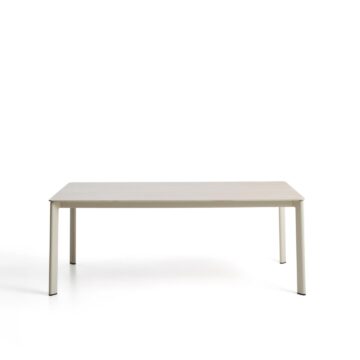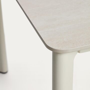 Miza Anafi iz sintranega kamna in aluminija v bež odtenku združuje sodoben videz, trpežnost in funkcionalnost za dolgotrajno uporabo. Zaradi odpornih materialov je primerna tako za notranje kot zunanje prostore, njen prefinjen dizajn pa se lepo poda različnim ambientom.