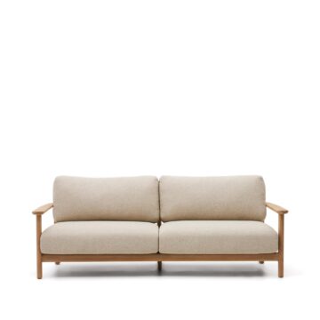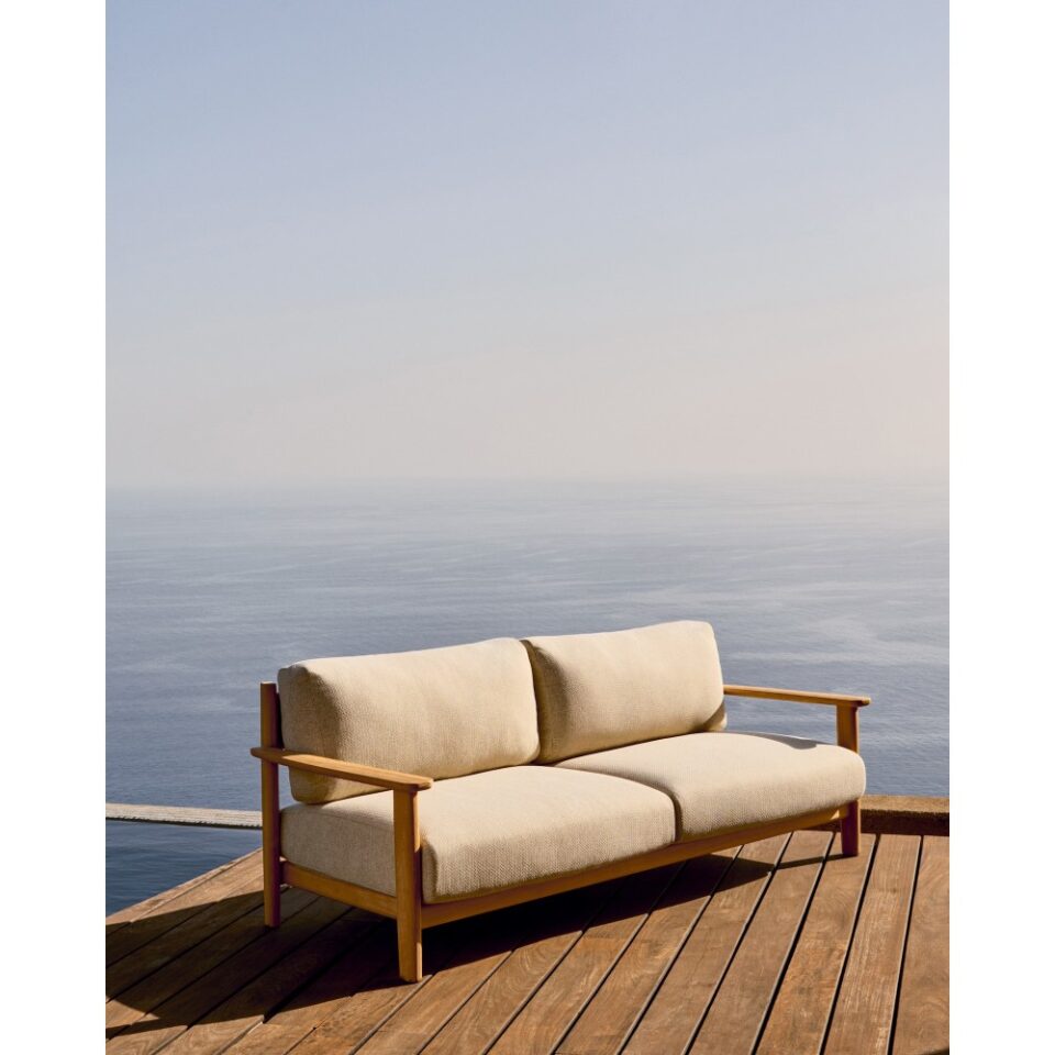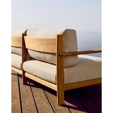 Zunanja sedežna garnitura Tirant iz tikovine s svetlimi blazinami, posneta pod kotom, poudarja naravni les in minimalističen dizajn.