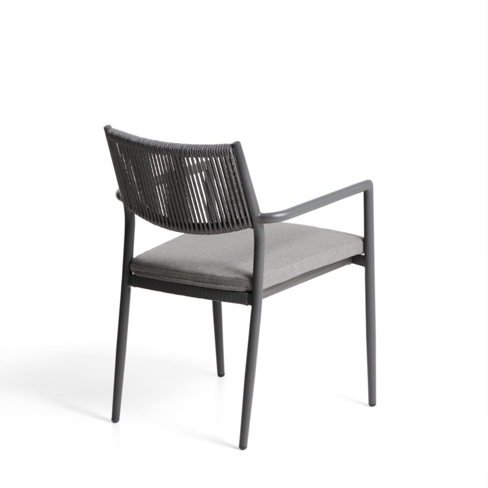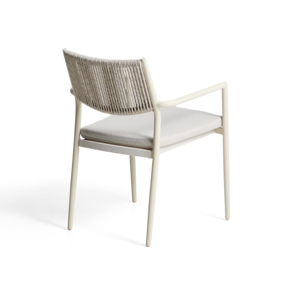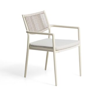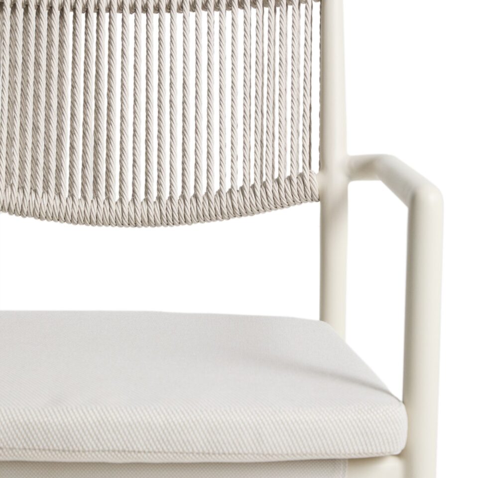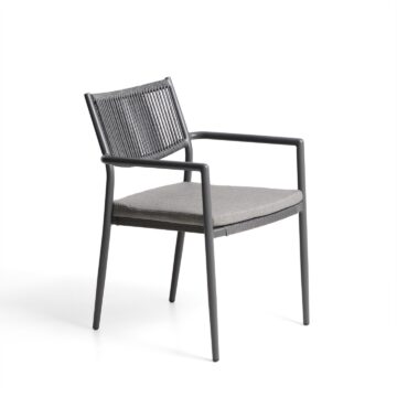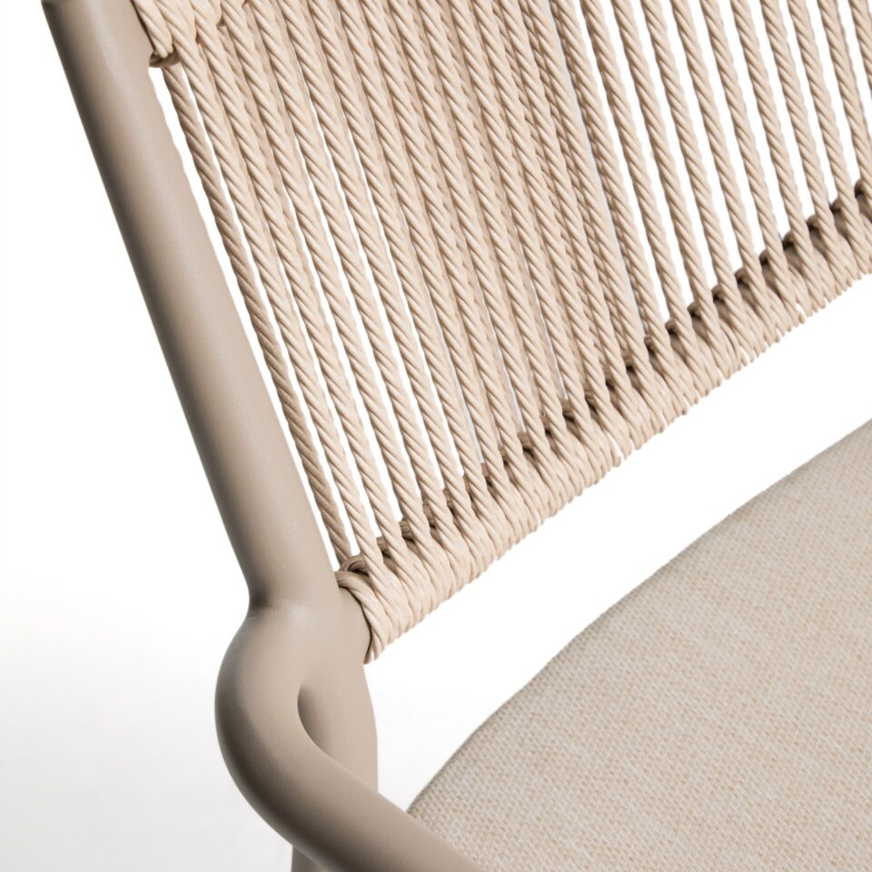 Stol Argasi združuje lahkotno aluminijasto konstrukcijo, trpežne materiale in umirjeno estetiko, ki se poda tako v notranje kot zunanje prostore. Aluminij je odporen proti rji, vlagi in soncu, ročno pleten naslon iz sintetične vrvi pa doda toplino in teksturo. Sedež vključuje odstranljivo blazino za dodatno udobje, stol pa je zložljiv za praktično shranjevanje.