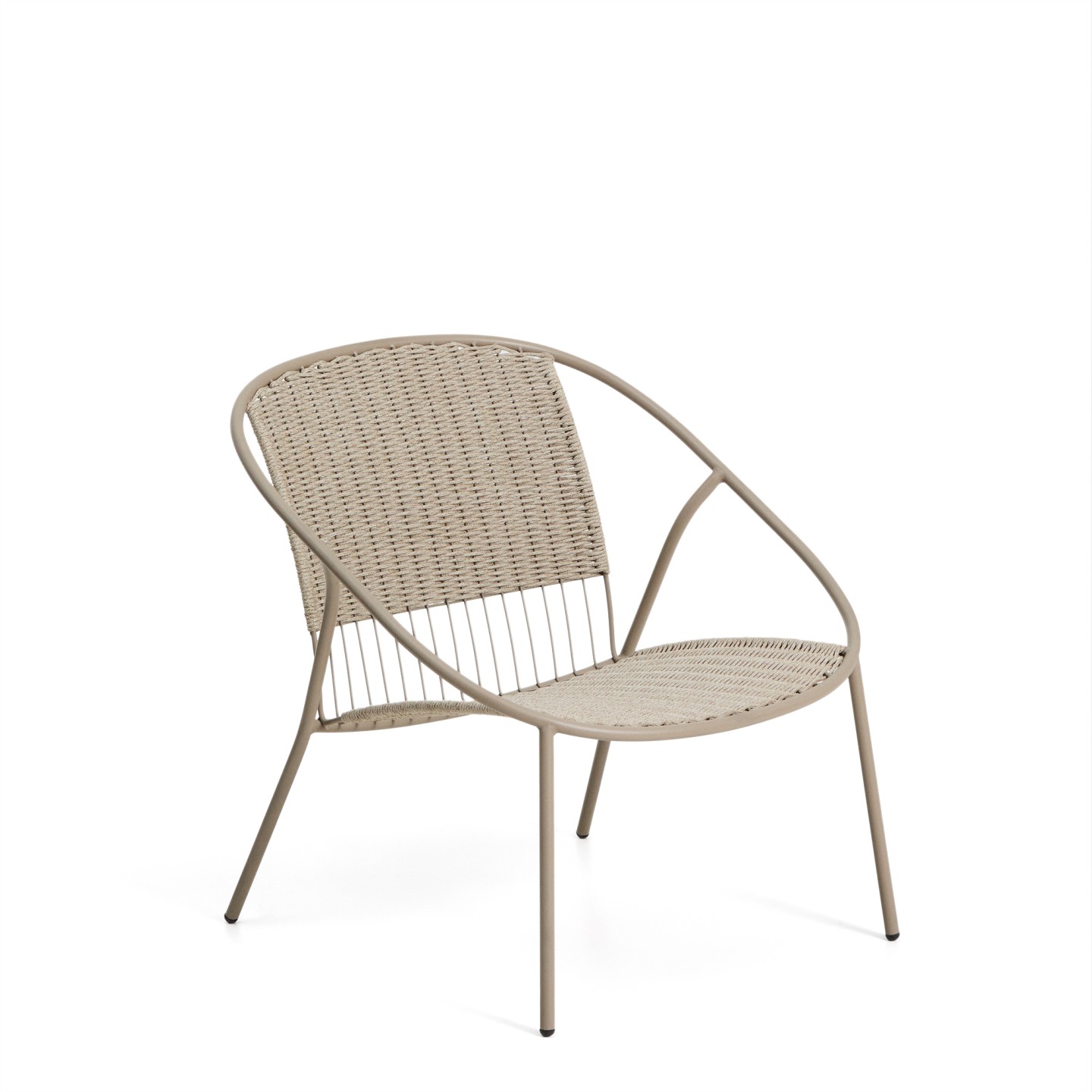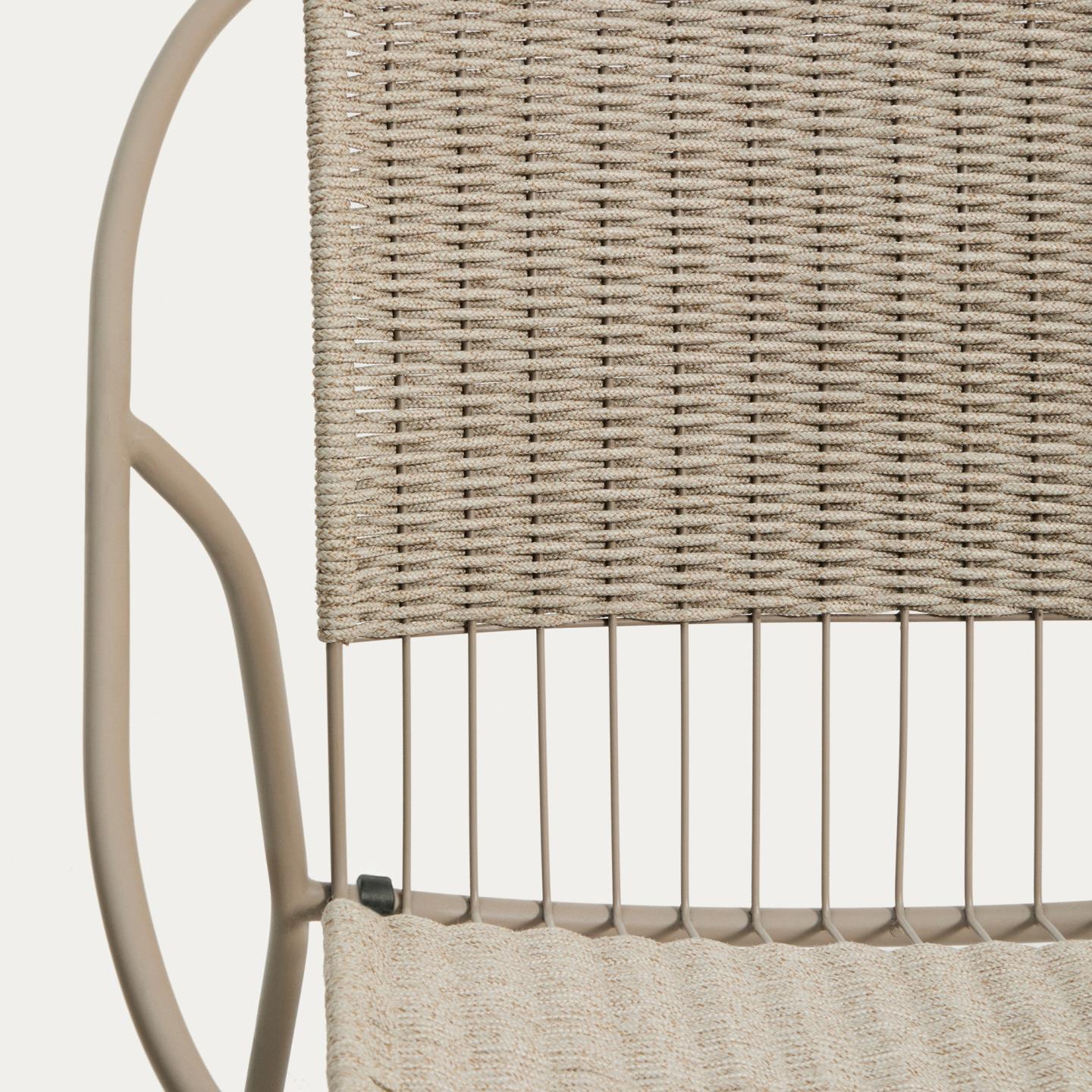 Zunanji fotelj Atrani iz galvaniziranega jekla in bež vrvi združuje lahkotnost, stabilnost in odpornost v sodobni zunanji izvedbi. Zasnovan je za udobno sprostitev na terasi, vrtu ali balkonu, materiali pa zagotavljajo dolgo življenjsko dobo tudi ob stalni izpostavljenosti vremenskim vplivom.