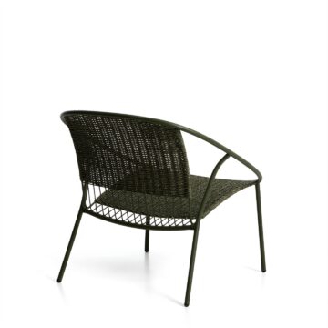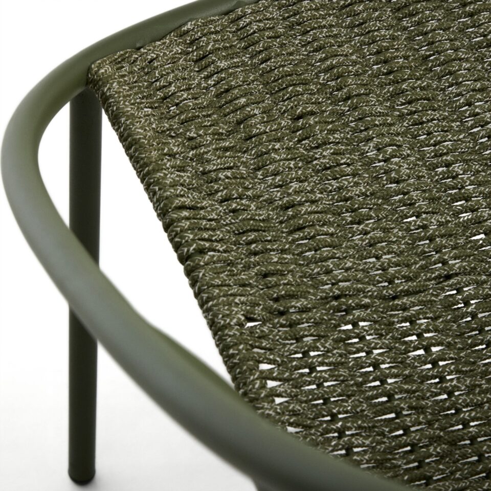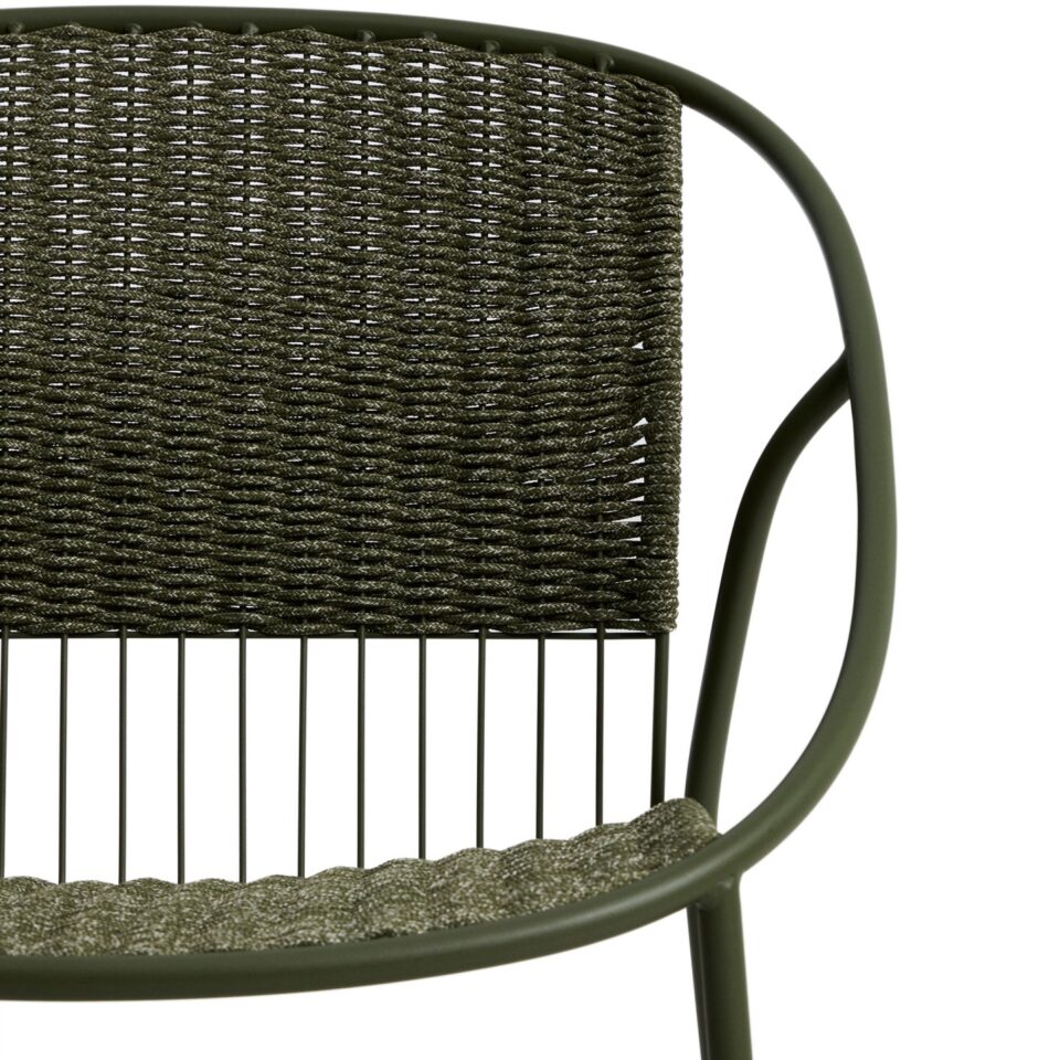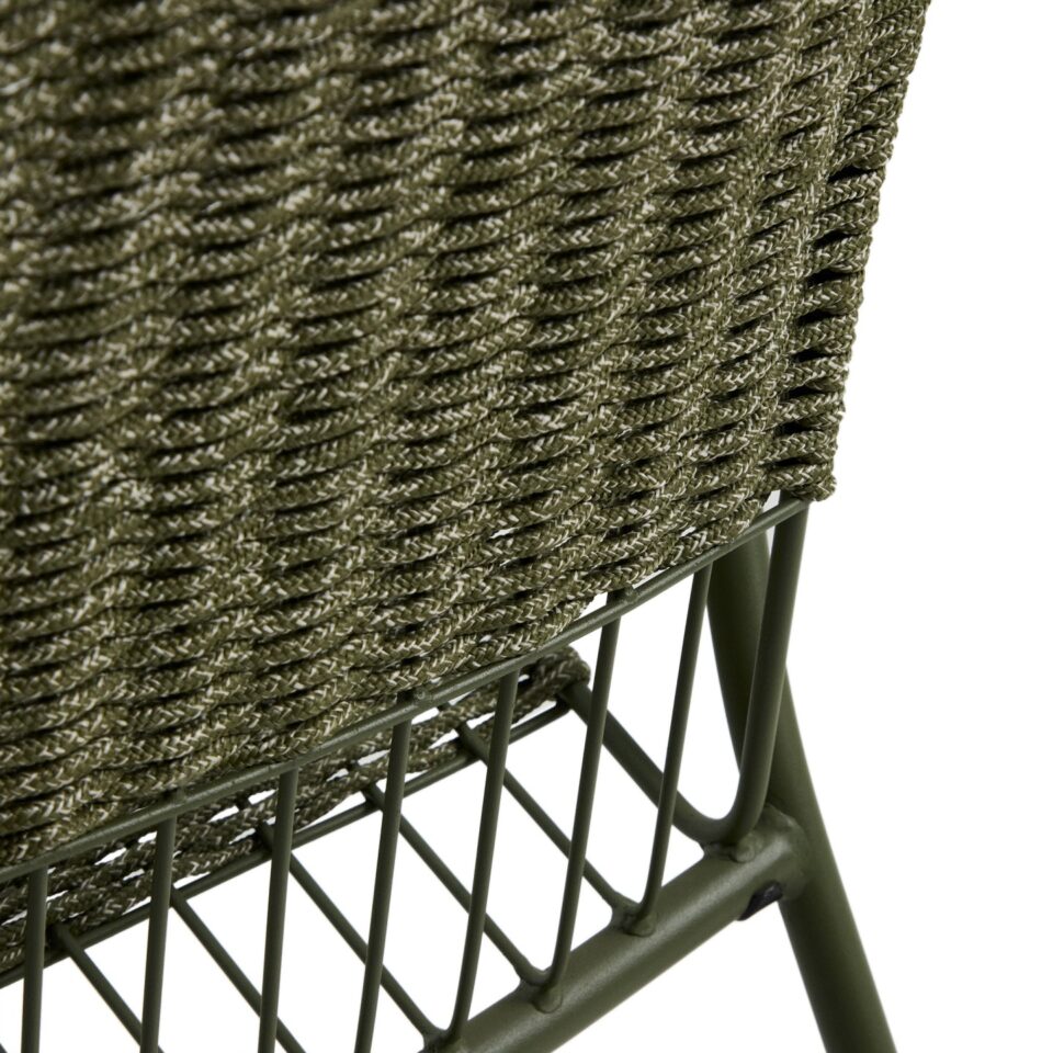 Zunanji fotelj Atrani iz galvaniziranega jekla in zeleni vrvi združuje lahkotnost, stabilnost in odpornost v sodobni zunanji izvedbi. Zasnovan je za udobno sprostitev na terasi, vrtu ali balkonu, materiali pa zagotavljajo dolgo življenjsko dobo tudi ob stalni izpostavljenosti vremenskim vplivom.