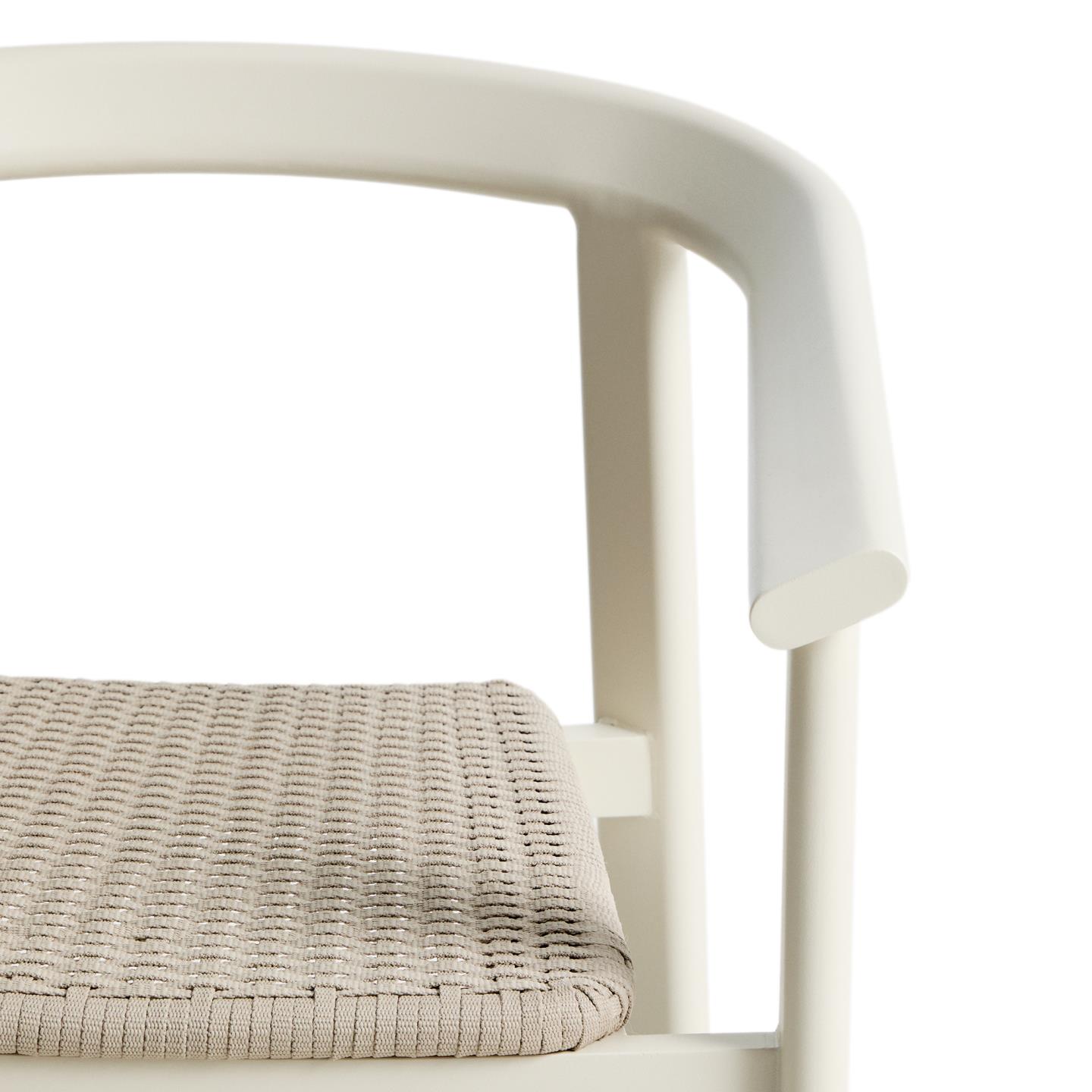 Zložljiv zunanji stol Erice z nasloni za roke združuje lahkotnost, odpornost in sodoben videz. Aluminijasta konstrukcija ter ročno pleten sedež iz vrvi ustvarjata uravnoteženo kombinacijo trajnosti in estetike, primerno za uporabo na prostem ali v notranjih prostorih.